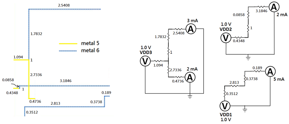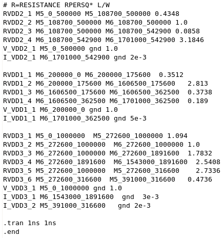Suppose the voltage of all power sources is 1.0V. According to the calculated resistances shown in Figure 4, the contestants need to create a SPICE netlist for IR-drop simulation using NGSPICE circuit simulator. Figure 5 shows the SPICE netlist for the circuits shown in Figure 4.