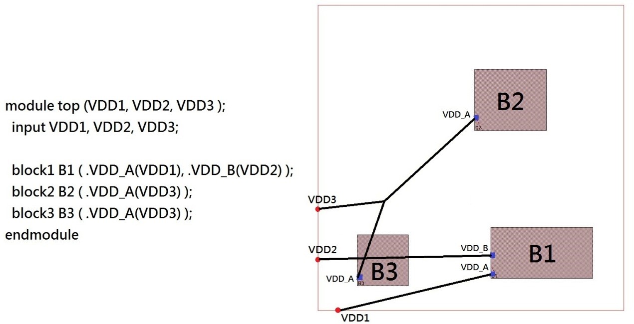 A Verilog netlist consists of a hierarchy of modules, connections between power sources and power pins of hard IPs. (As the attached file case1.v)