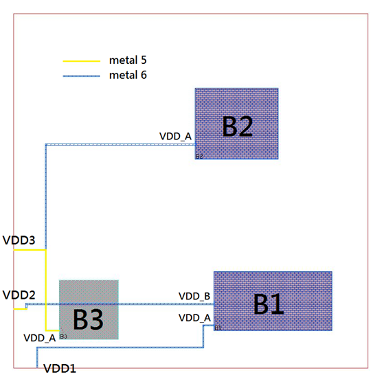 A simple power routing result is shown in Figure 2. Both horizontal wires and vertical metal wires in each metal layer may be used for routing power nets. Note that, because B3 uses only Metal 1 to Metal 5 layers, wires on Metal 6 layer can be used for power routing. Basically, a hard IP employs only a certain number of metal layers for its internal routing. Hence, upper metal layers not used by hard IPs can also be used for routing over the underlying hard IPs.