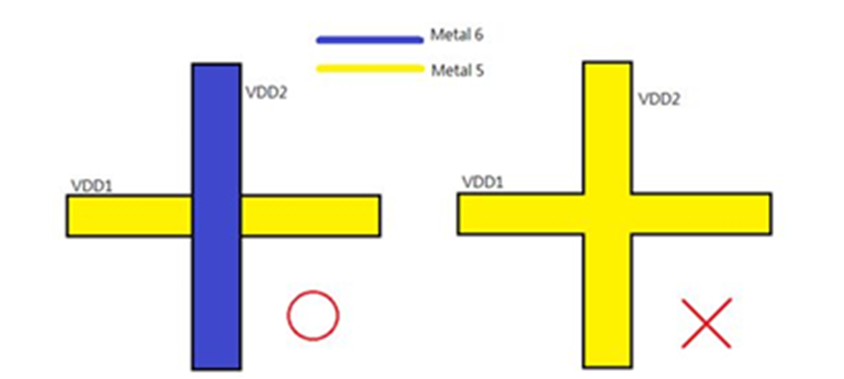- Metal wires used for routing different power nets can not be shorted, as shown below.